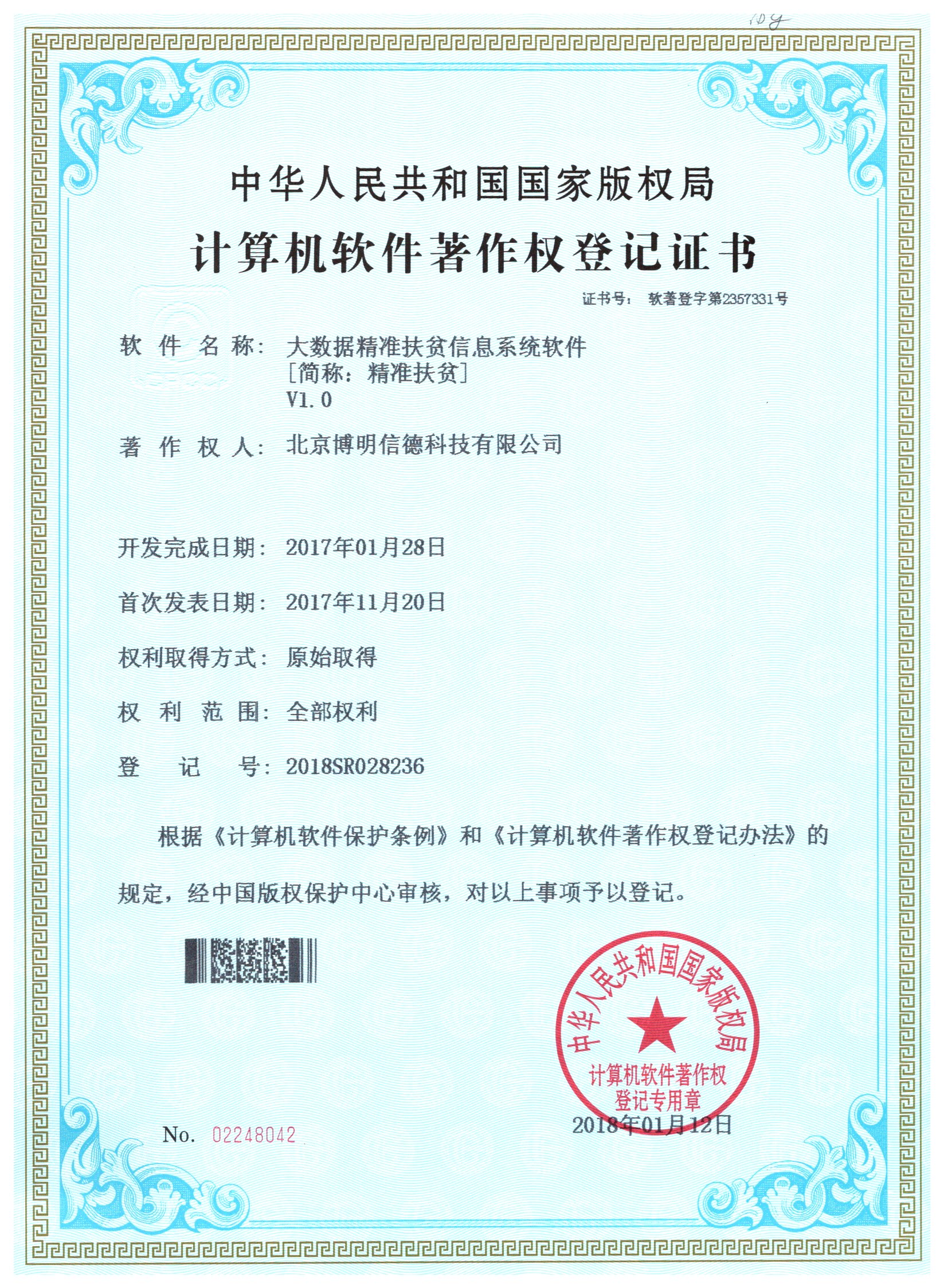 北京博明信德科技有限公司大数据精准扶贫管理系统获得著作权