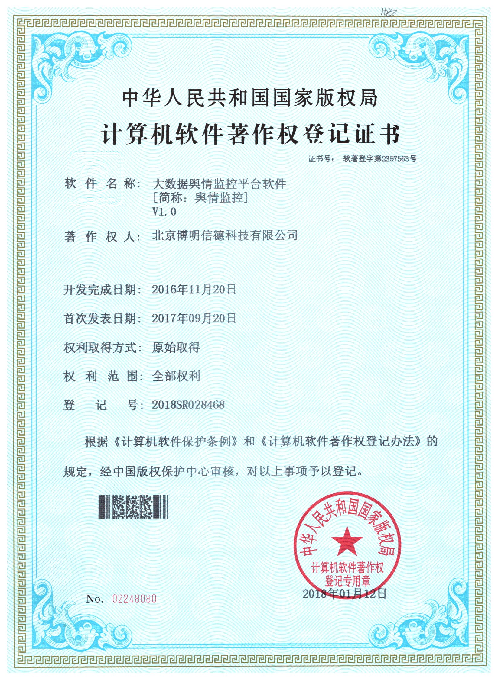 北京博明信德科技有限公司大数据舆情监控平台获得著作权